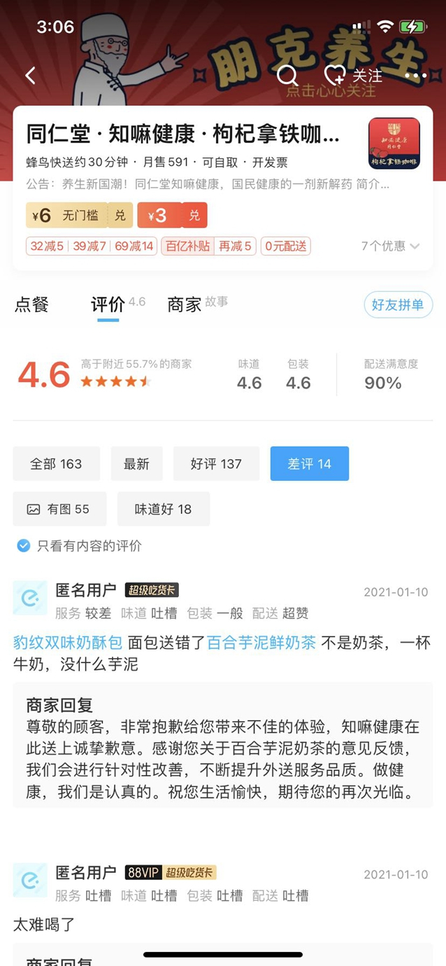 第一财经记者观察到,知嘛健康的咖啡饮品线上的销量和口碑都不突出。截至1月13日,知嘛健康·枸杞拿铁咖啡(双井店)在饿了么上的月销量为591,评分为4.6,而与其毗邻的星巴克店销量为1222,评分为4.8;Tims咖啡(乐成中心店)销量为2864,评分为4.7。其中,“同仁堂咖啡”遭到差评的原因多为包装侧漏和口味不佳等“硬伤”。