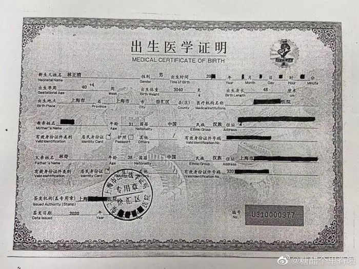 该博主同时晒出了一份新生儿姓名为“林正清”的出生医学证明和一份律师函。
