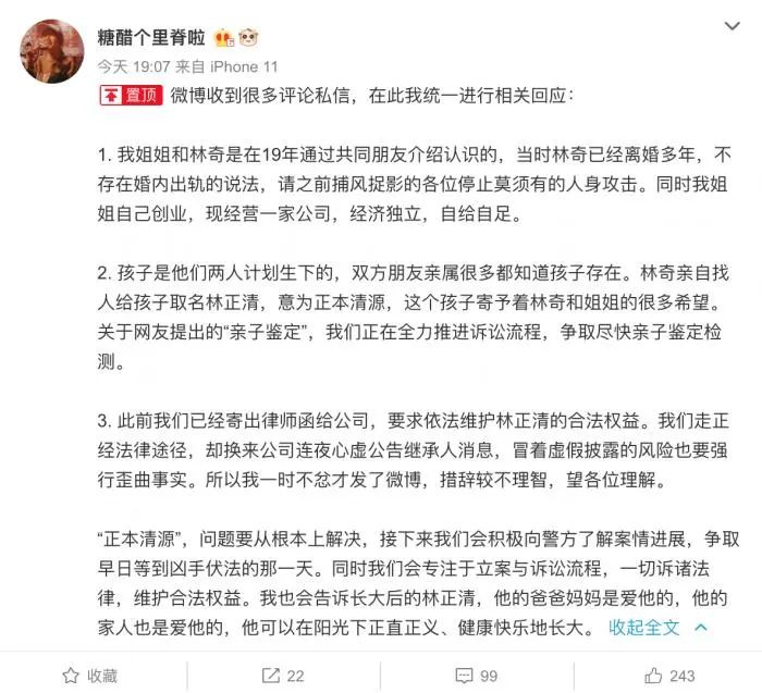 到了1月12日晚间19:07,该博主再一次发文解释,“我姐姐和林奇是在19年通过共同朋友介绍认识的,当时林奇已经离婚多年”,关于林奇小儿子的身份,“正在全力推进诉讼流程,争取尽快亲子鉴定检测。”