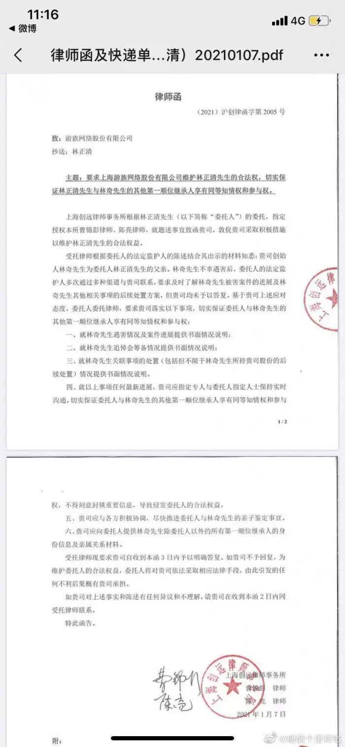 1月12日,一位名为“糖醋个里脊啦”的博主在微博上“三问游族网络”,称其姐姐和林奇已生有一子,但是游族网络“隐瞒林奇还有小儿子的消息”,“公告披露继承人却丝毫不提及,且周一收到我们的律师函,当晚就偷偷公布变更股东继承人”,其因此质疑上市公司信披存在问题。