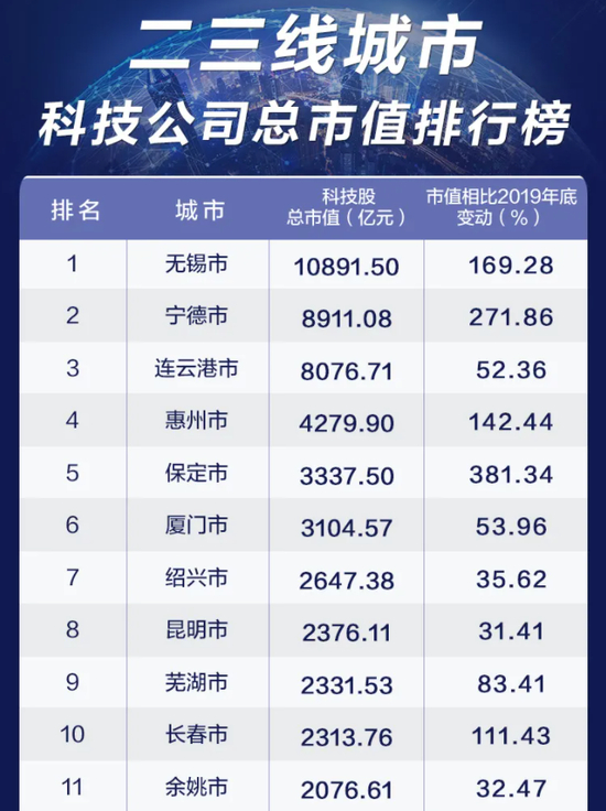 30个二三线城市科技公司总市值超过千亿元。市值增长最多的是保定市,相比2019年底大涨381%,系新能源汽车龙头之一的长城汽车股价大幅上涨所致。另外,新余、宁德、玉溪、淄博等市科技公司总市值增幅均超过两倍。