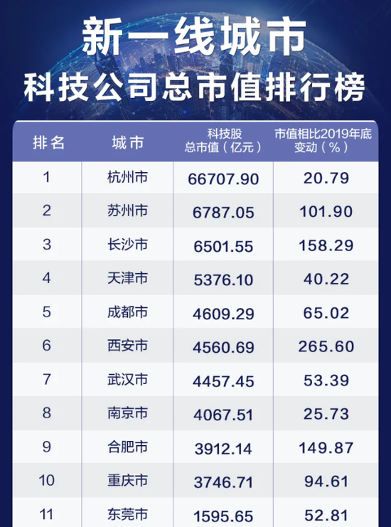 一些新一线城市正在奋力追赶之中,西安、长沙、合肥、重庆等城市最新科技公司总市值同比2019年底增长均超过100%。