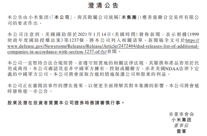 1月15日,小米集团午间发布公告称,公司注意到,美国国防部于2021年1月14日(美国时间)发布新闻,表示根据《1999财政年度国防授权法案》第1237条,将公司列入相关清单。公司确认其并非中国军方拥有、控制或关联方,亦非美国NDAA法律下定义的中国军方公司。