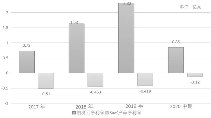 需要注意的是,虽然SaaS产品的占比连年上涨,且销售收入也一直表现不错,从2017年到2019年以及2020年截至中期分別为人民币1.79、3.29、5.1和3.33亿元,68.5%的复合年增长率远高于ERP的37.29%,但实际上一直处于亏损状态,如下图所示:
