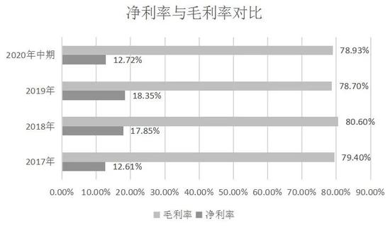 下图可以更直观地看出从2017年到2019年以及2020年截至中期,明源云净利润率与毛利率之间的差距: