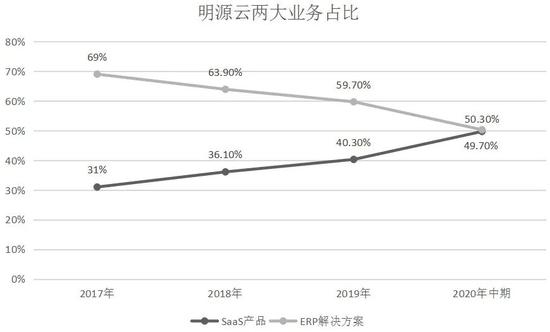近年来,明源云有意将业务重心向SaaS产品倾斜,相应的收入占比在不断提高。2020年中期SaaS产品销售贡献3.33亿,同比增長64.9%。