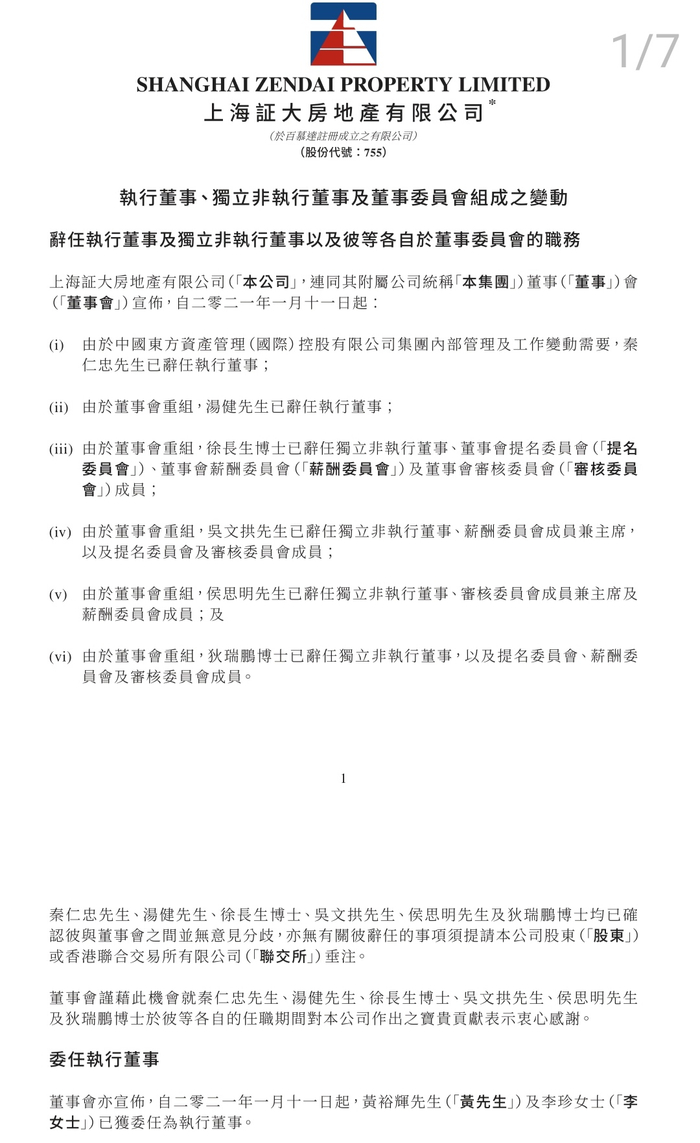 那一天,上海证大发布了一则公告,宣布了董事会的重组: