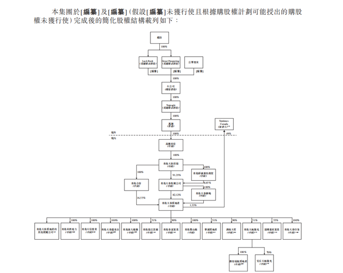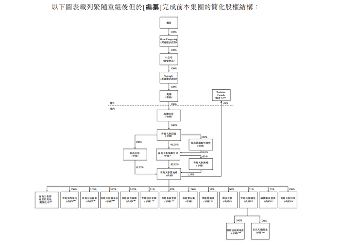 在天泰控股招股书中,重组完成后及上市前股权结构显示,青岛天泰集团公司通过直接和间接方式持股青岛天泰房地产83.45%,后者正是天泰集团境内房地产运营的主体,旗下控股多家房地产公司。