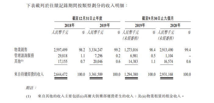 据了解,其收入主要来自物业销售、管理咨询服务和其他收入(包括高尔夫俱乐部运营、物业租赁租金收入)。其中,2018、2019年及2020年前9个月,天泰控股的物业开发及销售收入分别为25.98亿元、33.34亿元及29.14亿元,分别占同期总收入约98.2%、99.2%及99.4%。