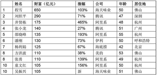 紧随其后,来自腾讯的刘炽平以290亿元财富位列第二;微信创始人张小龙以140亿元财富位列第四。蚂蚁集团董事长井贤栋和阿里巴巴董事长张勇,分别以175亿元和110亿元财富位列第三和第八。