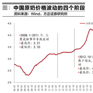 自2008年三聚氰胺事件爆发,中国乳制品行业遭遇严重的信任危机,再加上金融危机,下游乳制品消费疲软,原奶价格从2008年开始进入下降通道。生鲜乳供过于求,迫使奶农纷纷卖牛宰牛,原奶供给逐渐收缩,价格一路下跌,直至跌到2009年2.3元左右的低位。此后,随着国内经济回暖、大众对国产乳制品的信心逐渐修复,需求开始慢慢回升。