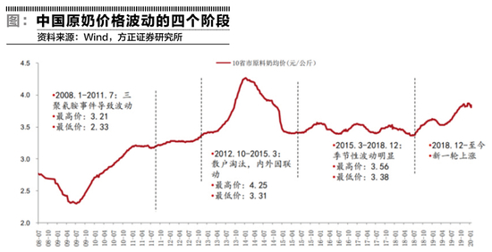从上图可以看出,2008-2019年,原奶价格波动区间为2.3-4.3元,原奶价格波动趋势为4-5年一个周期。从2009年8月的2.3元,到2014年3月4.2元,4年7个月完成一个上涨周期;从2014年4月的最高4.2元下降到2018年8月的3.3元,时间为4年4个月。