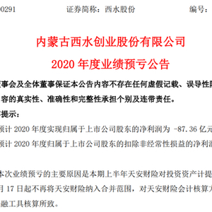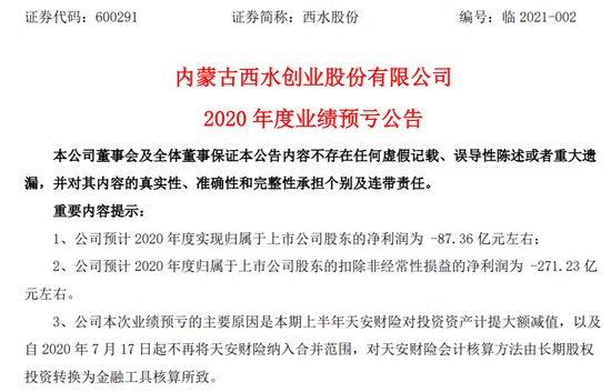 年报业绩季刚刚开始,市场就爆了一个巨雷。市值不足50亿元的西水股份,预计2020年扣非后净亏损271亿!主因是天安财险对投资资产计提大额减值。