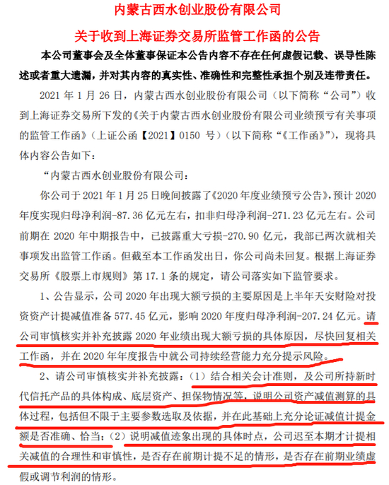 其实,西水股份在2020年中期报告中,已披露重大亏损270.90亿元,上交所已两次就相关事项发出监管工作函。但截至1月26日,西水股份尚未回复。