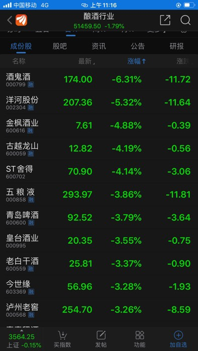 不过,在1月27日午间,又有媒体称上海市市场监管局表示“严打茅台加价销售”消息不实,并准备官方通报。受此消息影响,当天A股酿酒板块整体出现大幅下跌,截止午间收盘,酿酒板块最低跌幅高达3.89%,收盘跌1.89%,上涨酒企只有五家。白酒龙头贵州茅台(600519.SH)跌1.49%报收2016元/股。
