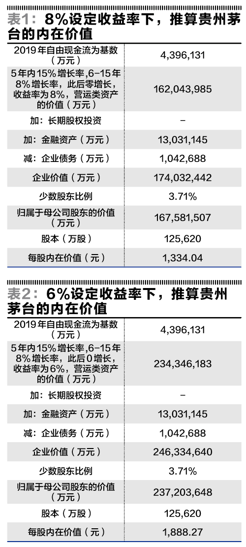 如果按照6%的设定收益率,按照相同的原理,按照5年内15%、6-15年8%、16年以后零增长假设,顺向计算每股内在价值的话,大致在1900元左右。