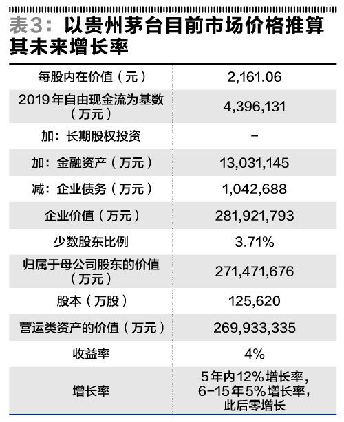 按照上述分析过程来计算贵州茅台在8%、6%和4%收益率情况下,未来5年按照15%的增长率、未来6-15年按照8%的增长率和16年以后零增长率的假设,分别计算其内在价值V。从长周期来看,随着中国人口老龄化,白酒行业在2035年后将接近零增长。由于2020年年报数据尚未公布,基期经营活动自由现金流数据为2019年的财务报表调整计算得出的数据,数据来源于Wind资讯数据库。贵州茅台2019年的经营活动自由现金流为439.61亿元,基本上与其利润表中的净利润相当(净利润中包含了非经营活动的利润)。