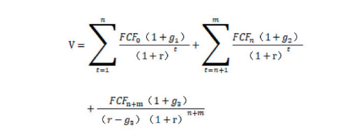 但上述公式在实际应用过程中,首先遇到的一个难题是t,在上市公司无限期持续经营情况下,无穷大的t无法应用于实际计算。在此做一些技术性处理,把计算期限设定为预测未来5年的自由现金流增长率、未来6-15年的自由现金流增长率以及从16年来开始的零增长率或者低速增长率三个阶段——一个公司长期的增长率一定会低于一个国家或者地区的GDP增长率,如果一个公司的长期增长率一直高于一个国家或者地区的GDP增长率,那么一个公司的规模将超过一个国家或者地区的GDP,而这种情况在现实中很难成立。由此,上述公式演变成经营活动自由现金流贴现的三阶段模型如下: