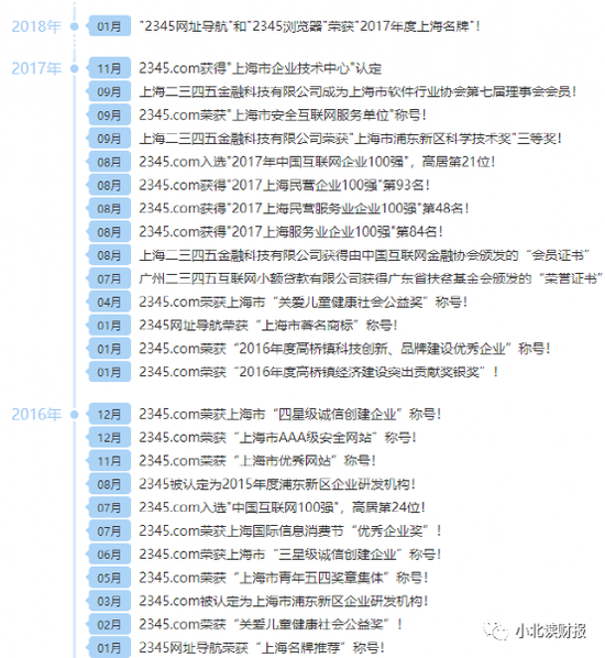 讽刺的是2345还多次获奖。打开2345的网站简介就能找到公司2005-2018年的大事记。2017年是最辉煌的一年,二三四五成为上海年度名牌,还入选中国互联网百强企业。