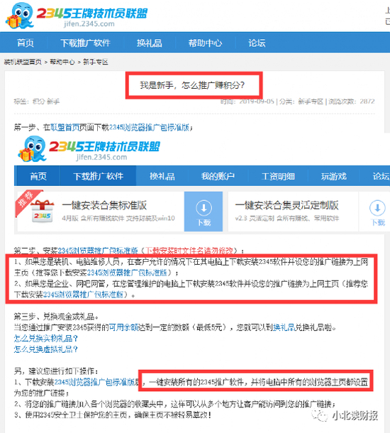 举个例子,小明是一个装机人员,他把2345全家桶嵌入到给客户安装的系统中。这样他每给别人装一次系统就能推广一次2345软件,自己就能获得积分。按照网站的宣传,每安装一台新电脑就能获得5元,2345已累计为程序员发放了15亿人民币……