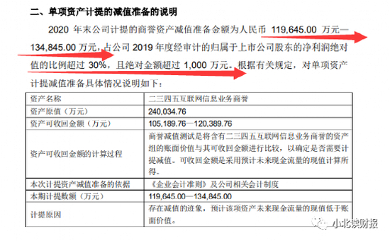 先说说眼下二三四五爆雷的事。前日,二三四五发布了2020年度资产减值的公告和业绩预告,公司对互联网信息业务一下计提了11.97-13.48亿元的商誉减值,直接导致年净利润亏损8-9亿元,比上年同期下降超200%。