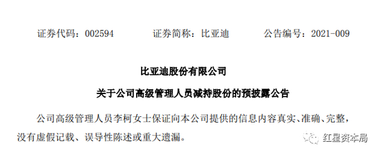 1月26日晚,比亚迪(002594.SZ)公告称,公司副总裁李柯女士因个人资金需求原因,将减持公司A股股份不超过100万股,占公司总股本比例不超过 0.04%。