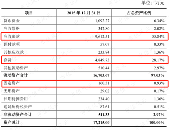 更有意思的是,这家公司的净资产只有1508万元,评估值是2.48亿元,溢价15.5倍。而其最大的资产却是应收账款,达4742万元,占当期8515万元总资产的56%,应收账款是净资产的3倍多。
