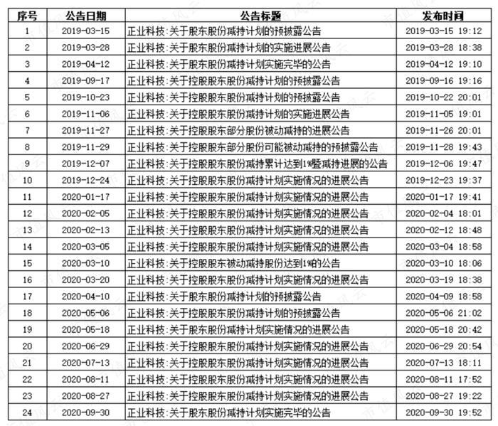 2020年以来正业实业频繁发布减持计划及减持进度。