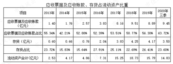其一,应收票据及应收账款,从2015年上市当期的0.76亿元增长到2020年三季度的9.45亿元,时隔不到5年却增长了12倍多。