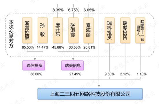 在这次重组中,海隆软件支付了26.5亿元的对价,交易对方是包括浙富控股(002266.SZ)及其实际控制人孙毅、庞东升、张淑霞(二三四五前身瑞创股份创始人韩猛之母)、秦海丽(瑞创股份创始人韩昌红配偶)在内的十八位自然人、法人。