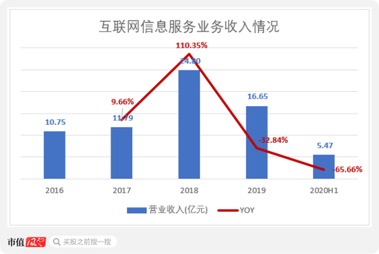 2019年,二三四五互联网信息服务业务收入降幅为32.84%;2020年上半年,该业务收入的同比降幅扩大至65.66%。
