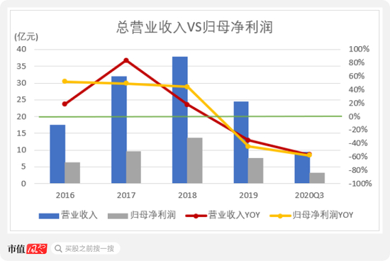 2016年~2020年9月,二三四五整体营业收入与归母净利润曲线均呈现倒V字形态。