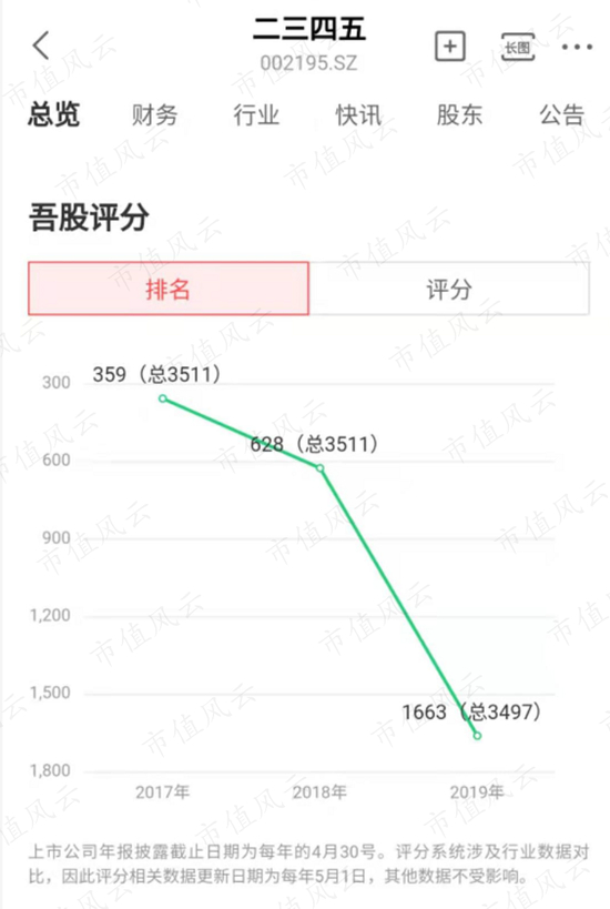 最近三年内,二三四五在吾股大数据评级系统中的排名从359名掉至1663名。