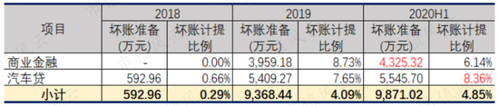 2020年上半年,汽车贷业务坏账的实际计提比例仍在增加,并拉高了两项业务整体的坏账实际计提比例。
