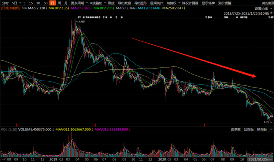 随着二三四五的营业收入、归母净利润双双下滑,上市公司的股价也一直跌跌不休。