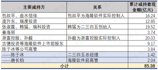 风云君统计了一下,自2013年8月浙富控股公告二三四五股权交易起算,包括上市公司前任大股东(海隆软件实际控制人)包叔平、二三四五创始人及亲属、公司高管在内的几个主要减持方,累计通过减持二三四五股票套现85.38亿元。