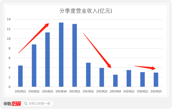 受前述两大主营业务变动影响,二三四五的营业收入也出现不同的季节性变动:2019年起,公司的总收入基本在每个季度里递减,且目前尚未有明确数据表明这一现象能在2020年第四季度得到改善。