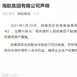 最后,进入重整程序后,海航集团拥有协商大额债权人、引进战略投资人等更多选择,海航集团争取稳定、可持续的生产经营环境在时间和空间上将更有保障。相信这也给广大投资人带来更多的希望。