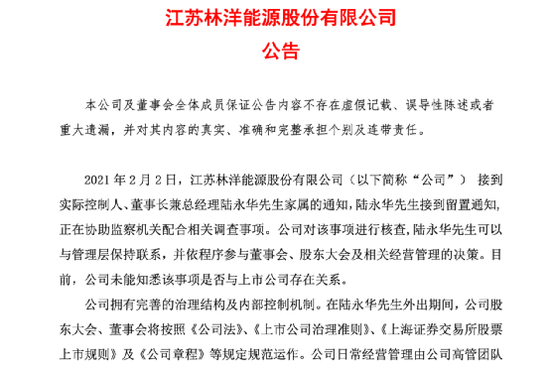2021年2月2日,公告显示,江苏林洋能源股份有限公司(以下简称“公司”) 接到实际控制人、董事长兼总经理陆永华先生家属的通知,陆永华先生接到留置通知,正在协助监察机关配合相关调查事项。公司对该事项进行核查,陆永华先生可以与管理层保持联系,并依程序参与董事会、股东大会及相关经营管理的决策。目前,公司未能知悉该事项是否与上市公司存在关系。