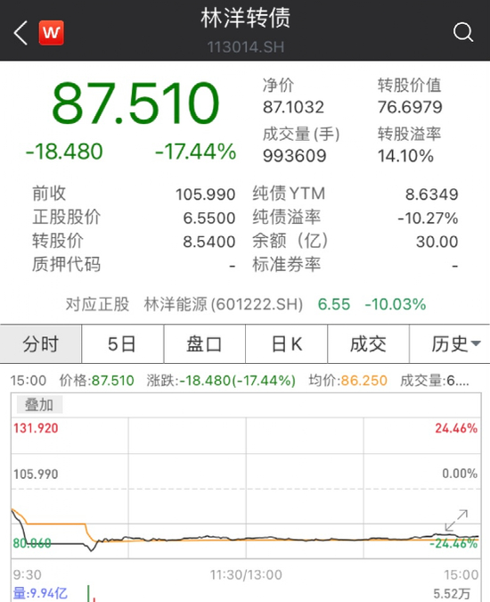 随后林洋转债有所反弹,截至收盘报87.51元,跌17.44%,成交量993609手,转股溢率14.1%。