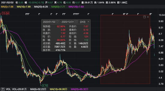 近年来该股股价波动较大,2020年受行业板块的影响,股价累计涨超60%。不过就目前6.55元/股的股价而言,较其2015年“高光时刻”股价已经跌超88%。