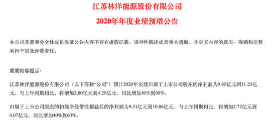 1月26日,林洋能源发布2020年年度业绩预告,预计2020年实现归属于上市公司股东的净利润为9.80亿元到11.20亿元,与上年同期相比,将增加2.80亿元到4.20亿元,同比增加40%到60%。