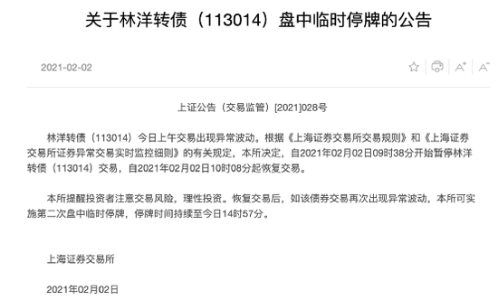 2月2日,由于林洋转债盘初大跌20%,上交所公告宣布临时停牌。停牌前,林洋转债报84.79元。