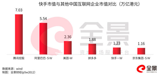 快手市值超1.23万亿港元,位居港股第9位,接近百度的2倍,超过京东,成为中国第五大互联网公司,仅次于腾讯、阿里、美团和拼多多。在A股所有上市公司中,快手市值也可以排到第8位。