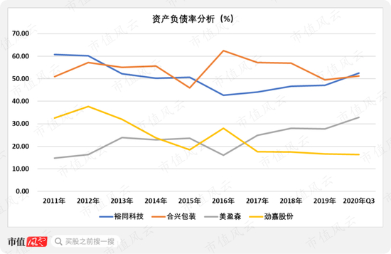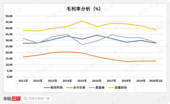 裕同科技相对较低,2016年曾跌至42.61%,但随后逐步回升,2020年Q3为51.16%,总体上与合兴包装较为接近。