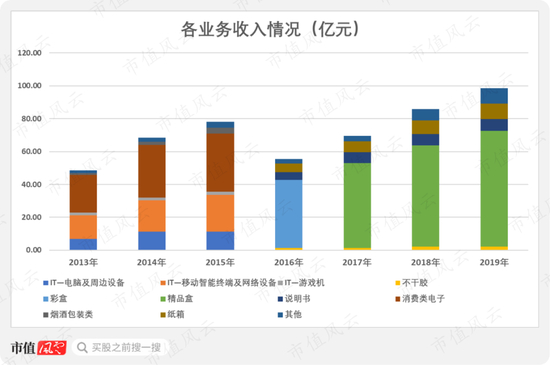 从2013年至2015年,烟酒包装类收入从1.07亿增长至3.54亿,发展速度较快,2015年后未披露具体营收数据。