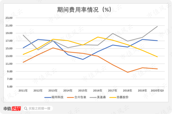 裕同科技和美盈森的期间费用率在2019年双双上升至17%以上,随着业务量的扩大,期间费用的增速明显高于营收,表明其管控成本能力下滑。