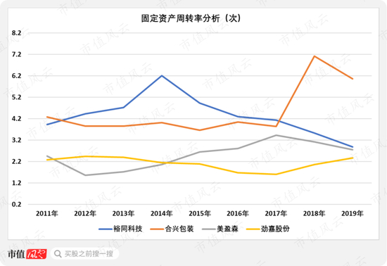 合兴包装的固定资产周转率原本低于裕同科技,自2017年起开展PSCP业务后,传统业务也受益于平台整合而出现营收大涨,因此固定资产周转率明显上升至2019年的6.06次。