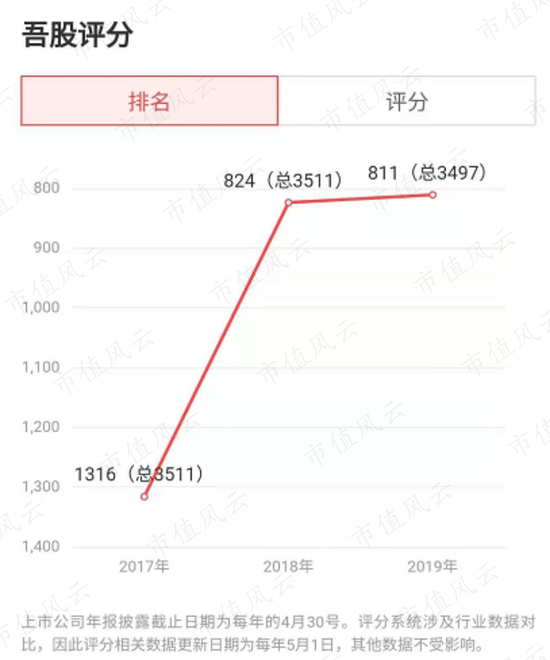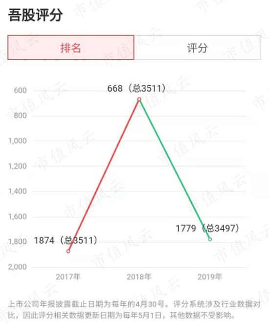 根据市值风云“吾股大数据”系统显示,2018年的评分和排名最高,为82.1分和668名,2017年和2019年的评分和排名很接近,表明2019年财报质量出现一定程度的下滑。