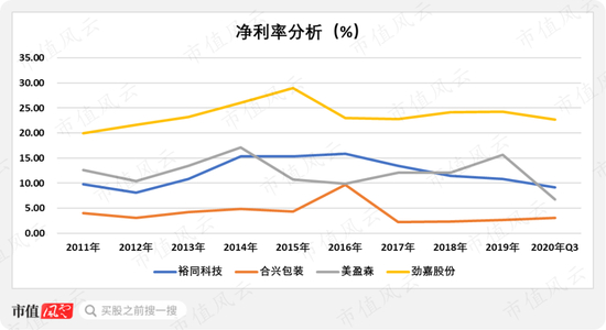 如果从盈利能力分析,合兴包装的劣势就更为明显了。